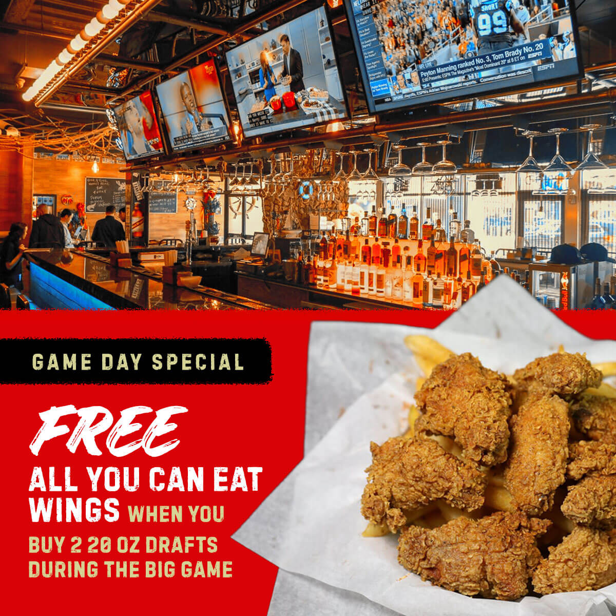BUY 2 20OZ DRAFTS, GET FREE ALL YOU CAN EAT WINGS DURING THE GAME